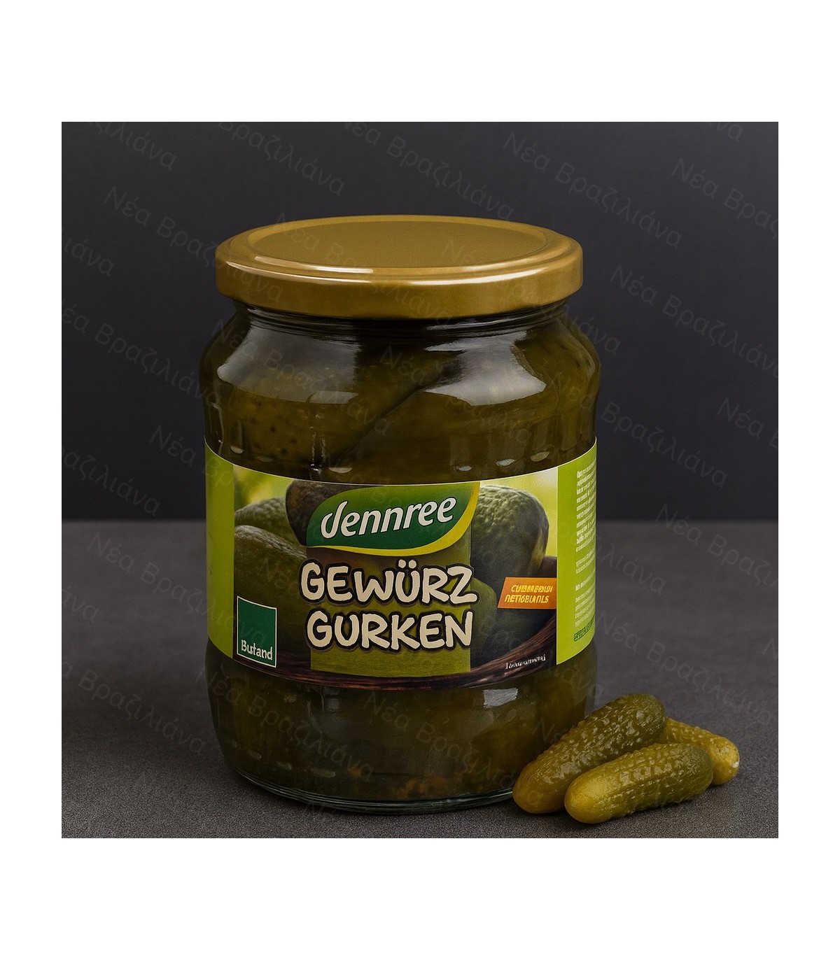 Συστατικά: αγγουράκια*, ξύδι χονδρικής*, ζάχαρη από ζαχαρότευτλα*, θαλασσινό αλάτι, σπόροι μουστάρδας*, κρεμμύδι*, άνηθος*, μπαχαρικά* (πάπρικα*, πιπέρι*).