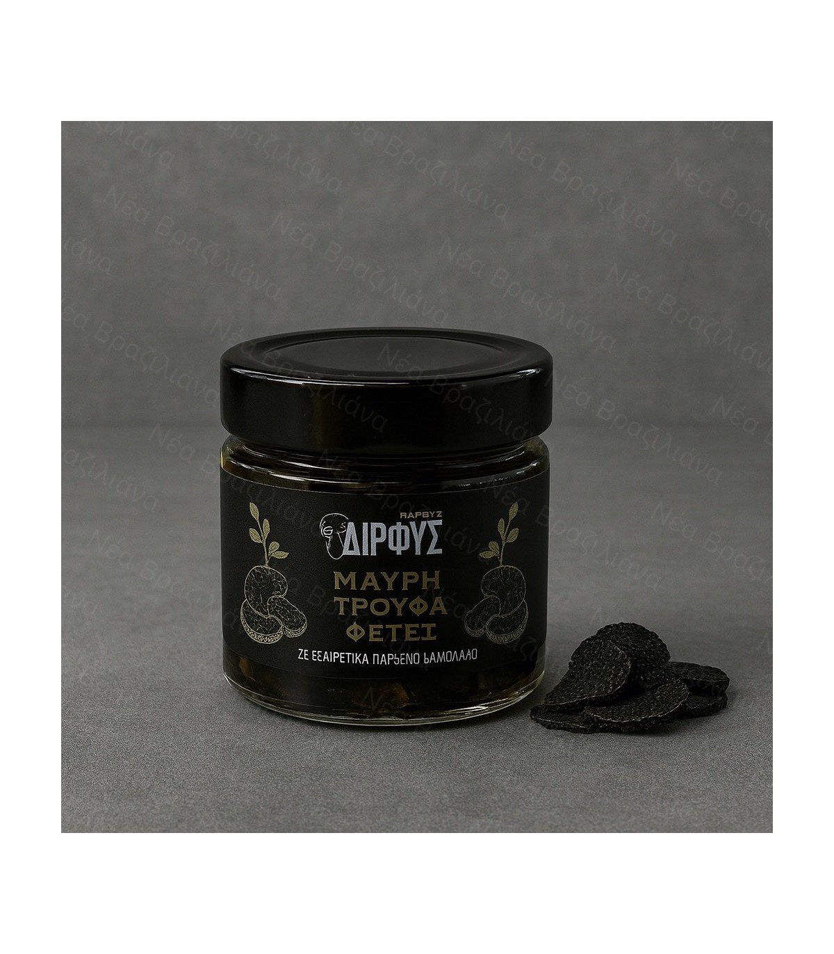 Λεπτές φέτες μαύρης τρούφας (Tuber aestivum) σε έξτρα παρθένο ελληνικό ελαιόλαδο, αλάτι , ελαιόλαδο με άρωμα τρούφας. Δεν περιέχει συντηρητικά . Διατηρείται αναλλοίωτο σε ξηρό περιβάλλον σε θερμοκρασία δωματίου.