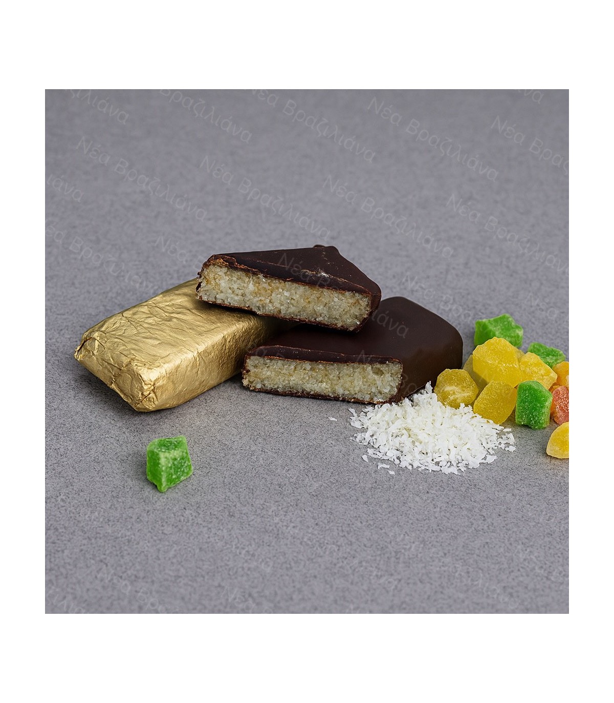 Κέρασμα σοκολάτας με ινδική καρύδα, επικάλυψη από μαύρη σοκολάτα και με προσθήκη γλασαρισμένων φρούτων για έξτρα νοστιμιά.