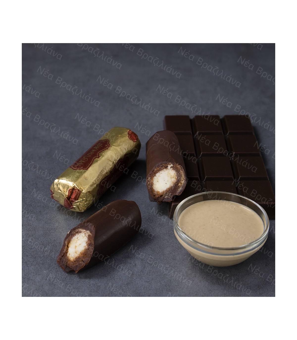 Πουράκια με γέμιση κρέμας χαλβά και επικάλυψη σοκολάτας κουβερτούρας.