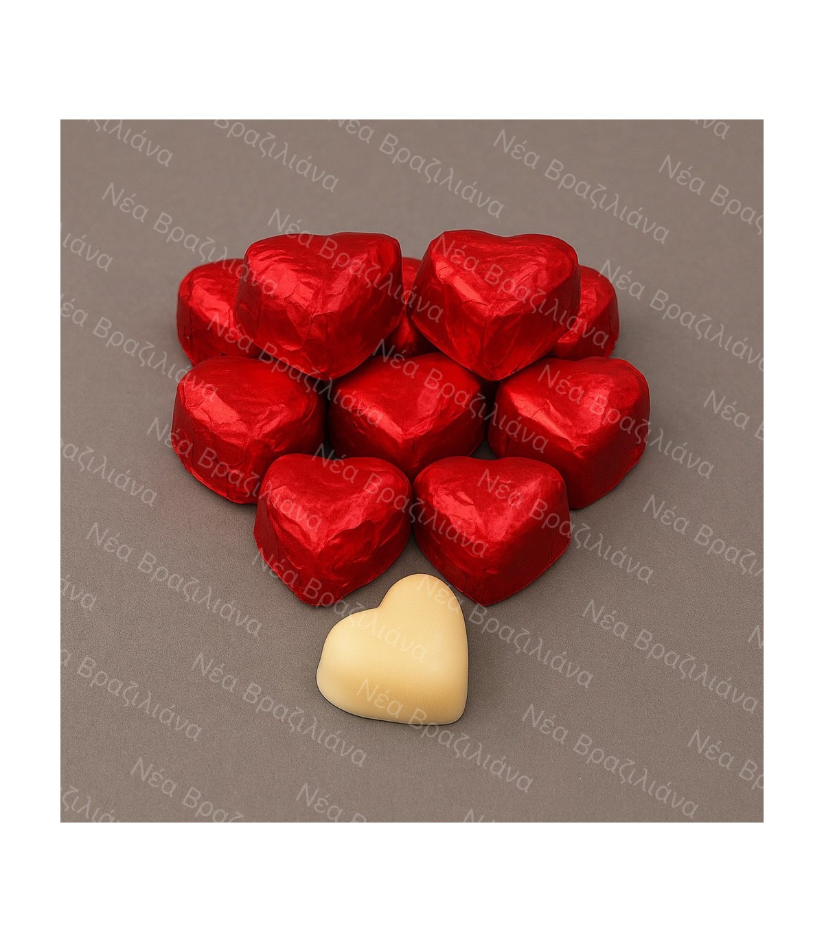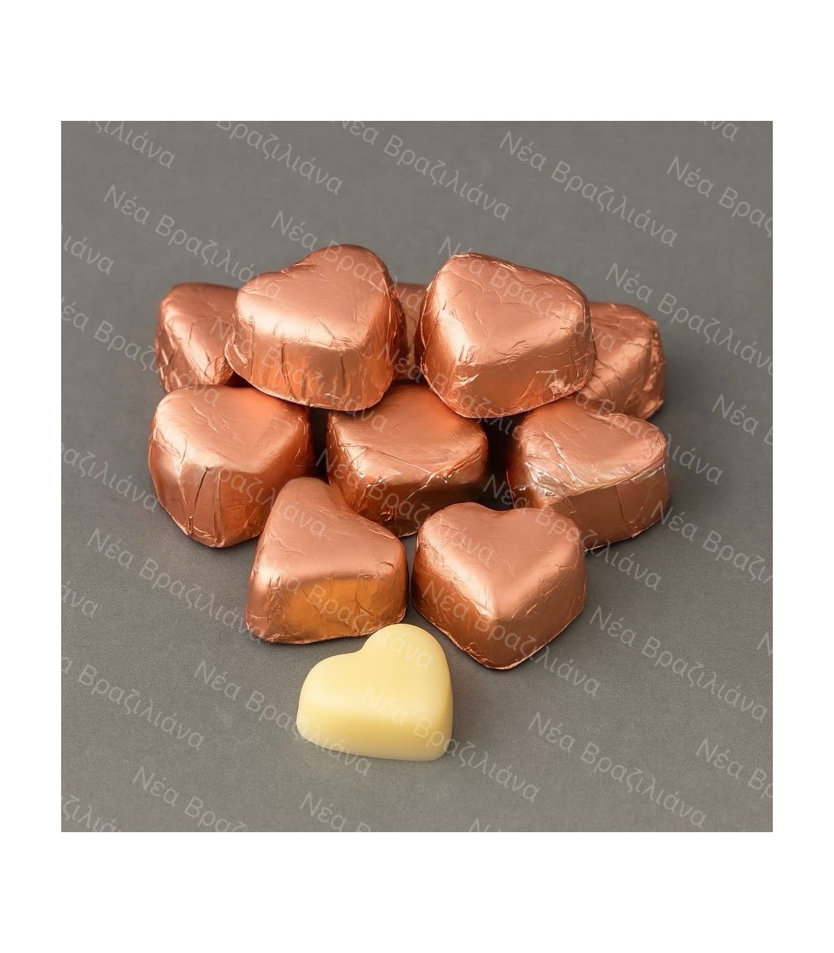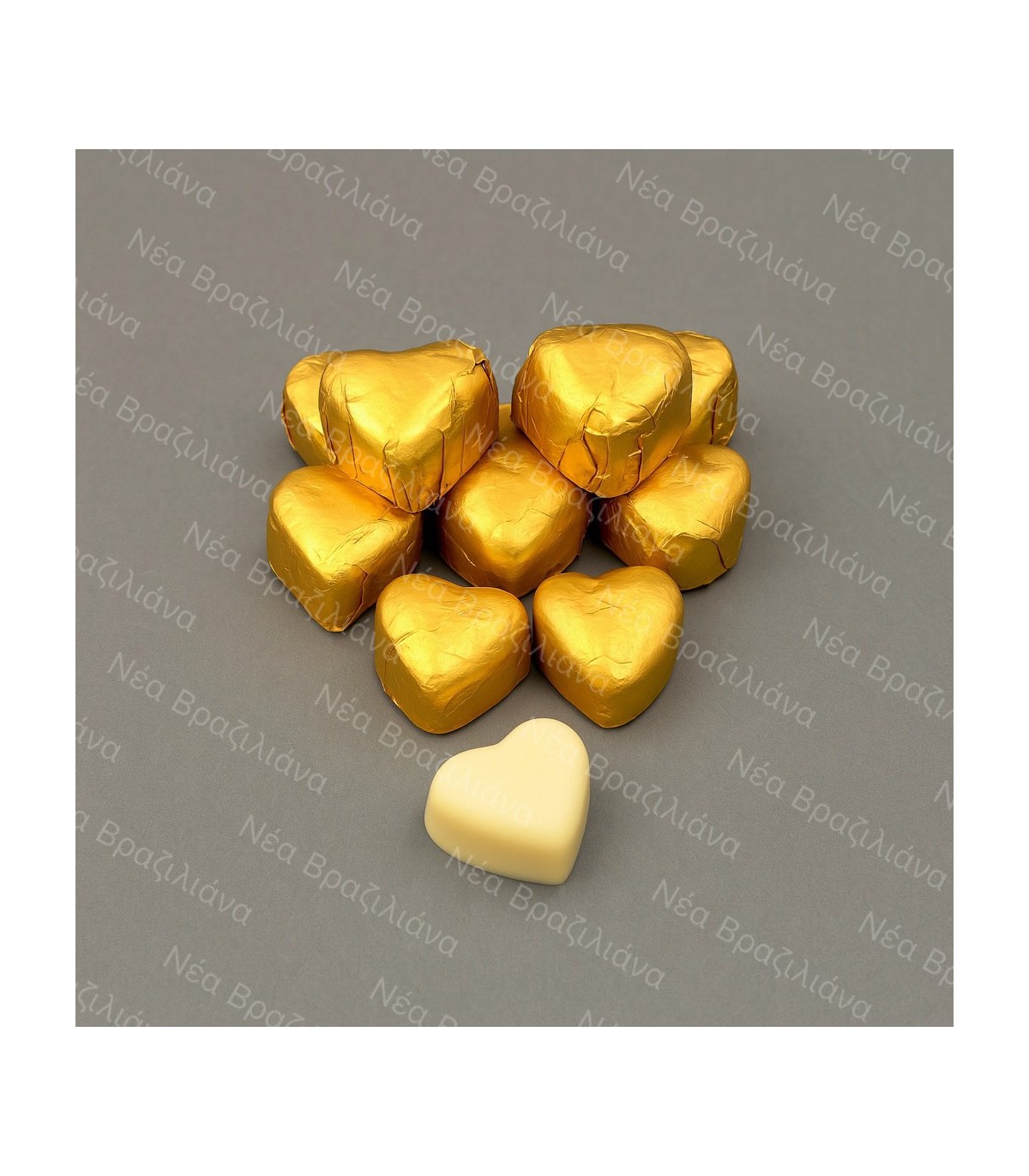 Τυλιχτά σοκολατάκια με απομίμηση λευκής σοκολάτας σε σχήμα καρδιά. Σε τρία διαφορετικά χρώματα: κόκκινο, χρυσό και σομόν.
